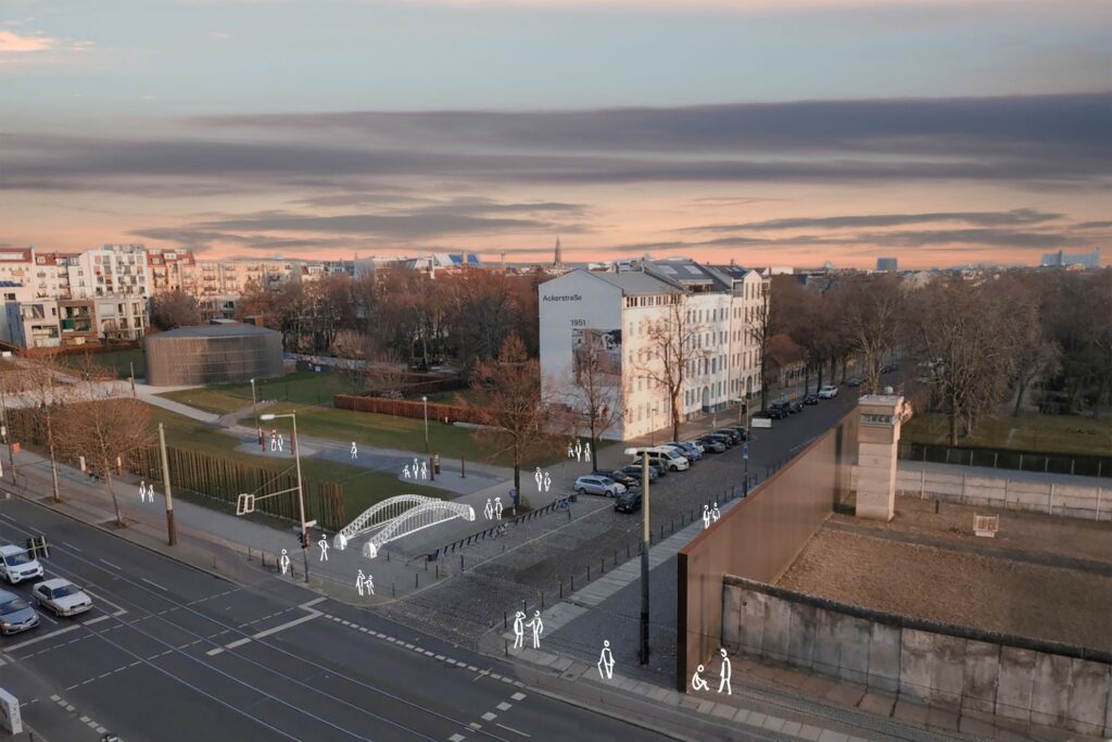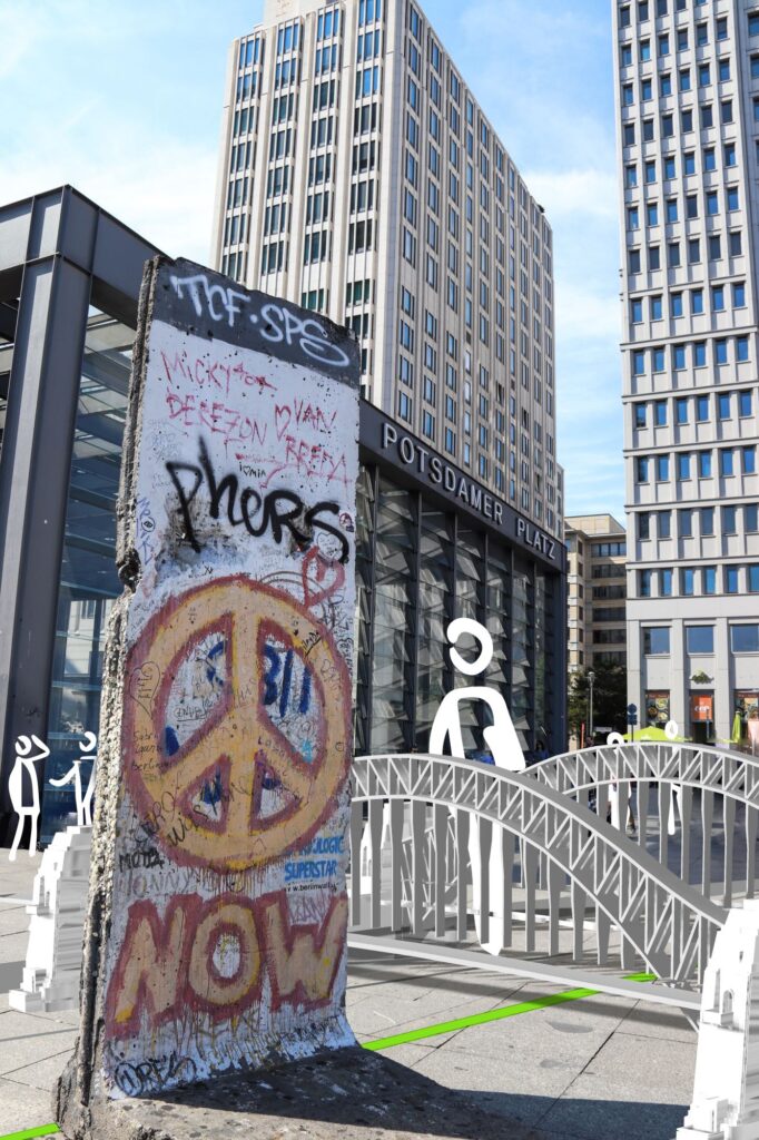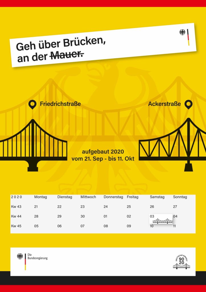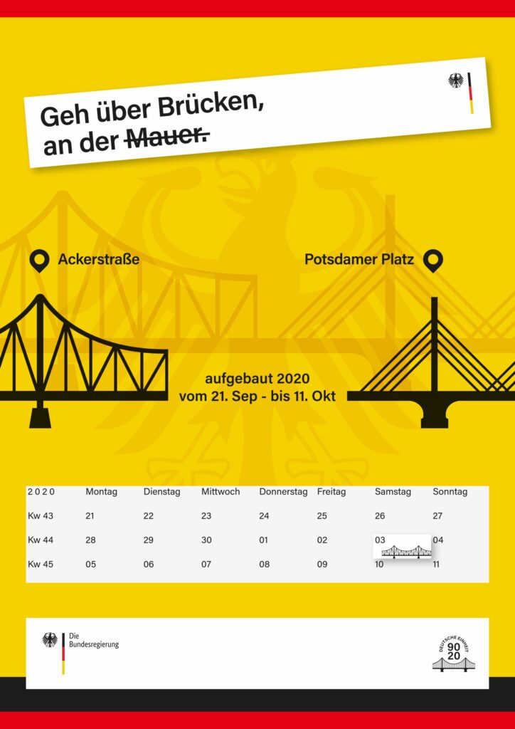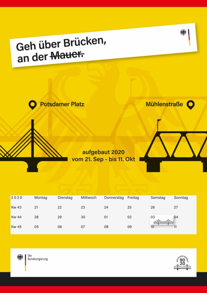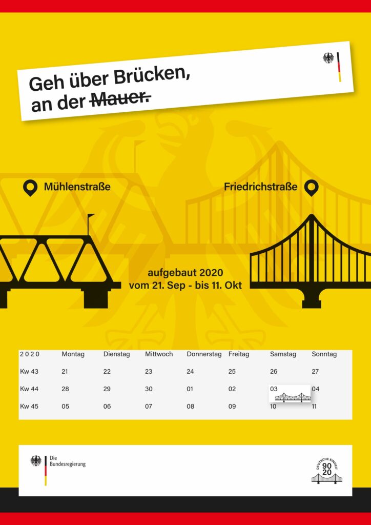 Um neben den Plakaten etwas Physisches zu haben, was einen bleibenden Eindruck hinterlässt, habe ich Modell Brücken in Berlin simuliert, die sinnbildlich vom „Osten“ in den „Westen“ führen. Passend zu der Leitbotschaft „Über Brücken gehen“ habe ich das Logo, die Plakate und die Renderings entworfen.