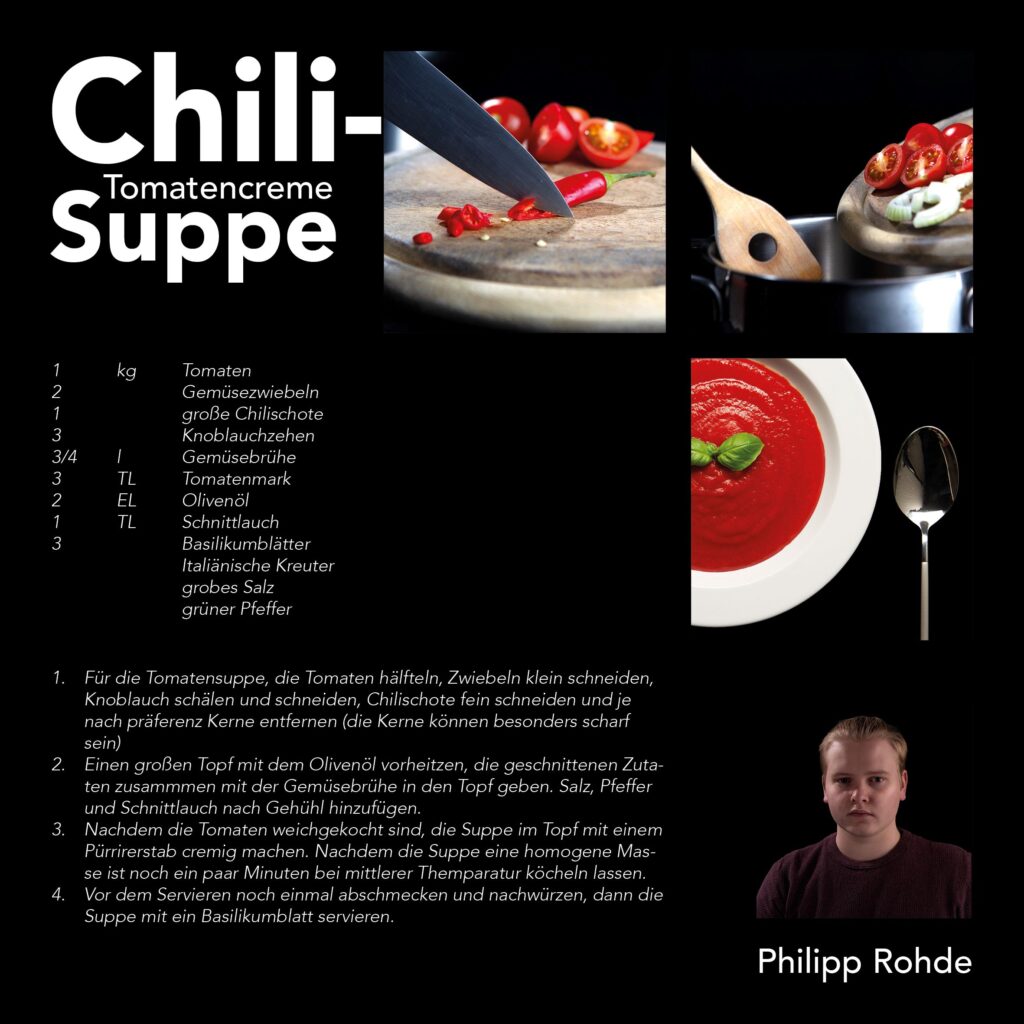 Im Rahmen eines Klassenprojektes haben wir jeweils zu einem Monat ein passendes Gericht gestaltet und zu einem gemeinsamen „Klassen-Jahres Kochbuch“ zusammengefügt. Es sollten ein Titelbild, drei Making-of-Bilder und ein Profilbild in einer Bildsprache produziert werden.