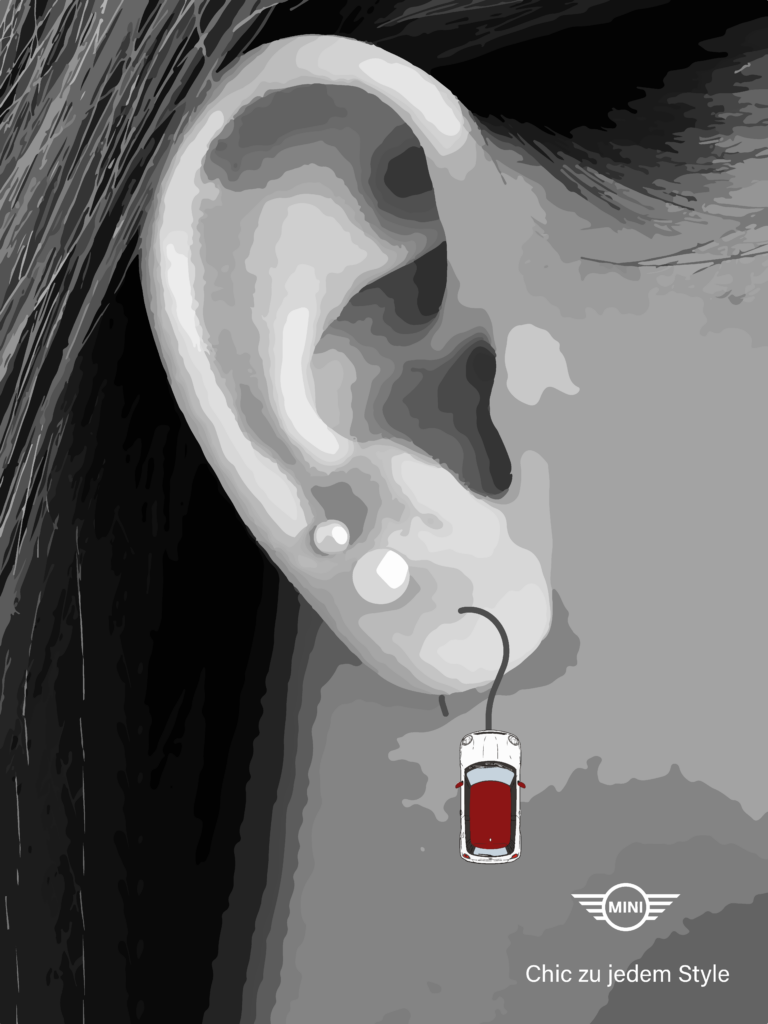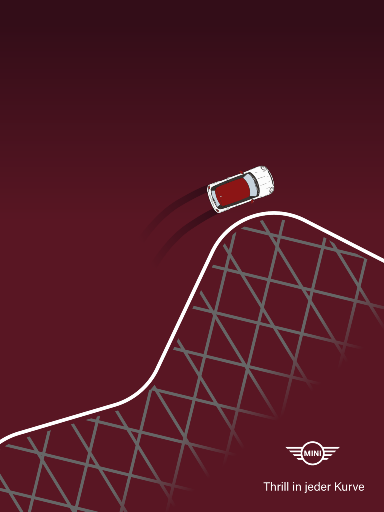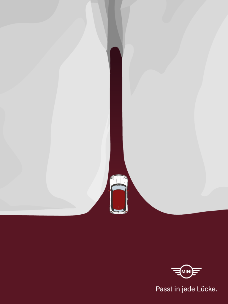 Nach einer Ideenfindungsphase wurden diese verschiedenen Motive konzipiert. Anschließend wurde Mini passende Automarke identifiziert und die Plakatkonzepte wurden umgesetzt.